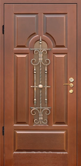 Красивый внешний вид немаловажное, но не самое главное преимущество металлических дверей с элементами ковки. Такие двери еще и очень надежны. Они изготавливаются из холоднокатаной стали толщиной 1,4-2 мм, отделываются массивом, корабельной фанерой, натуральным шпоном или МДФ-панелями, покрытыми виноритом. Установив на нее замки 3 или 4 класса взломостойкости, вы получите дверь, вскрыть которую с помощью грубой силы практически невозможно.
